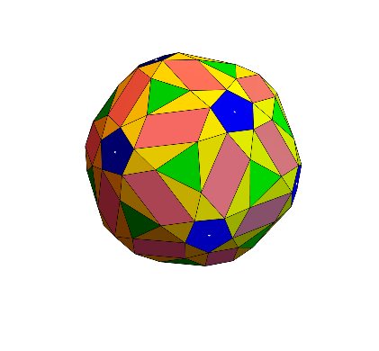 Now we can create a 3D Penrose tiling on a spherical surface(icosahedral to be specific, but it can be inflated to a sphere)! This is the complete model of simplified subunit structure of the capsid.