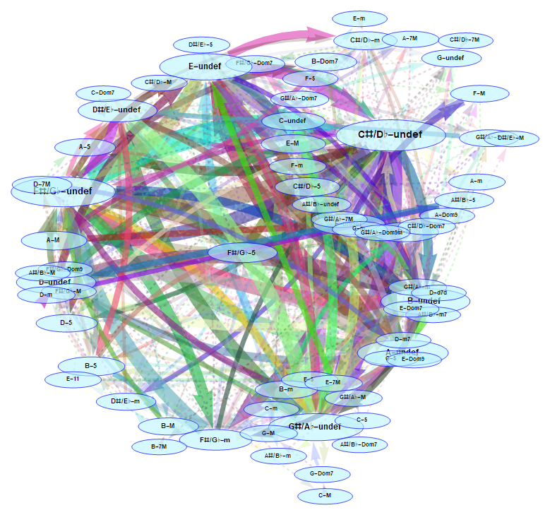 The edge thickness is a function of the amount of times a certain transition between two chords has occurred in the chord sequence. There is an option (namely the normalizationSpec argument) to enable or disable using a Softmax function for assigning thicknesses to edges. This is due to the fact that for simple/short chord sequences, Softmax is actually counterproductive because it suppresses secondary but still top-ranked transitions; i.e., it assigns a very high thickness to the most frequent transition and a low thickness to all other transitions (even those that come in second or third in frequency ranking). But for large or complex sequences it is actually useful, because it "gets rid of" a lot of the [relatively] insignificant instances, thus making the output actually understandable (and not just a jumbled mess of thick lines).
