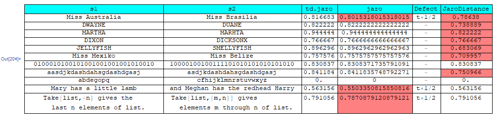 the pink 1do not go into the count, because they are not the rolling first ones in both directions seen from the beginning. One is left with m = 11, 6 perfect matches and 5 mismatches. This would count for a 2 t = 5 = 11 - 6, whereas the python implementation has 2 t = 4. This raises the idea, that not all mismatches must be count, but the existence of some permutation of more than 3 characters has to be realized, making the implemention more complex, as follows: