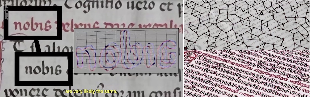 To avoid hunting and cleaning real datasets, lets "simulate handwriting" reflecting on randomness of the character shapes. I also like it because it touches upon some art sides of things, relevant to generation of beautiful random fonts. And actually due to ancient writers' (for example monks) skills and attitudes often handwritten characters will differ less than the typed ones we distort here artificially (see image above). It's a different story of course if we to compare between handwritings of different authors, which is a challenge and what the Venice project envisions ultimately. This becomes even harder if the letters of a handwritten word are seamlessly connected.
