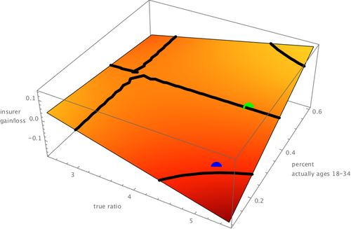 Mathematica notebook on Dropbox showing the computation. The idea, is that one finds a linear relationship between age and premium relationship that just covers claims payments for any value of the true ratio but subject to the constraint that the premium the oldest person pays can not be more than three times bigger than the premium the youngest person pays and under the assumption that those under age 35 constitute 38% of the pool. One then determines profits for any combination of true ratio and percentage of the pool under age 35. The process takes a little algebra (mostly rescaling operations), some calculus (finding expectations of distributions) and some visualization.