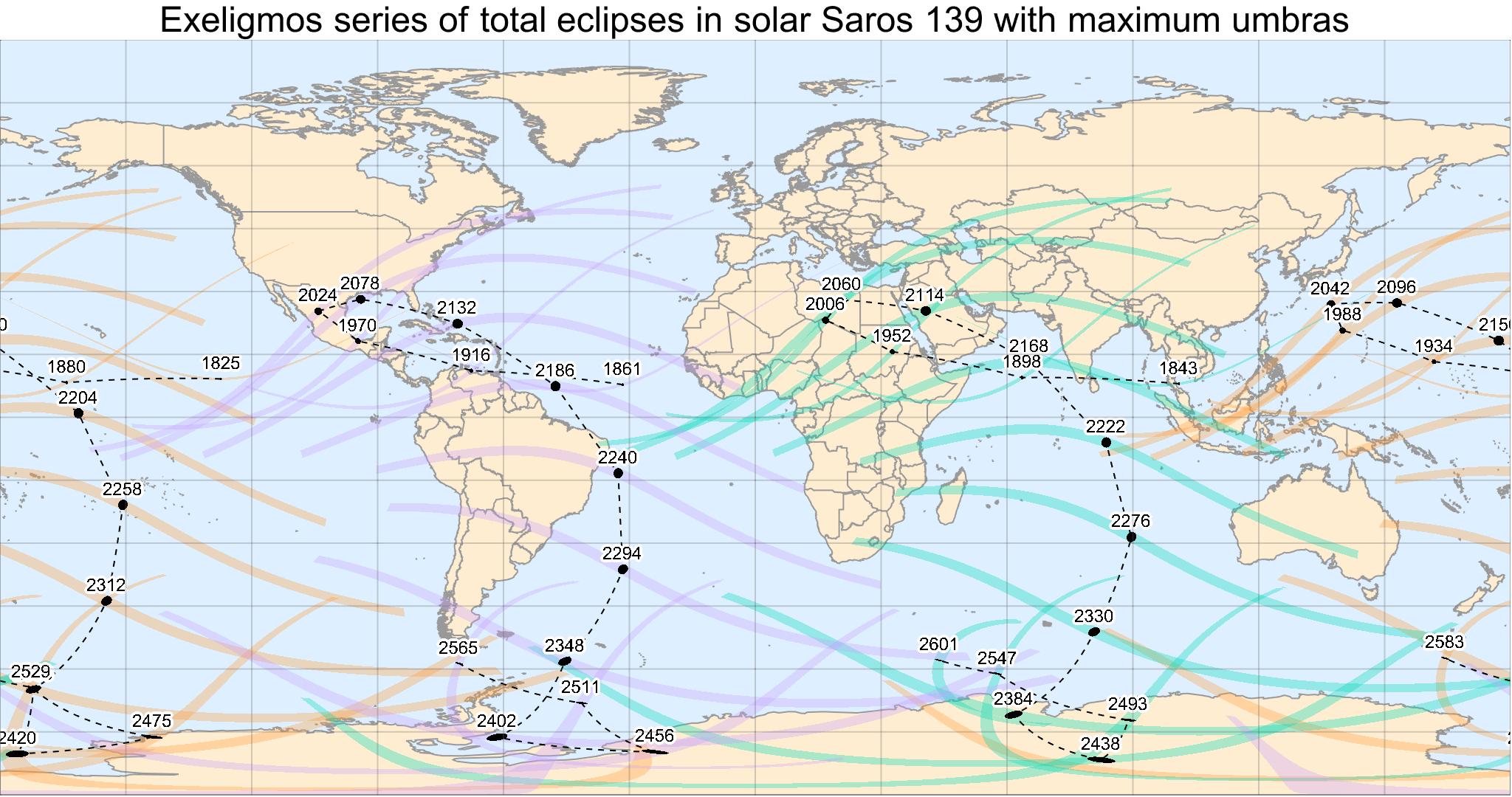 Very interesting map! It's a great idea to connect the maximum eclipse locations as you did with the dashed lines.