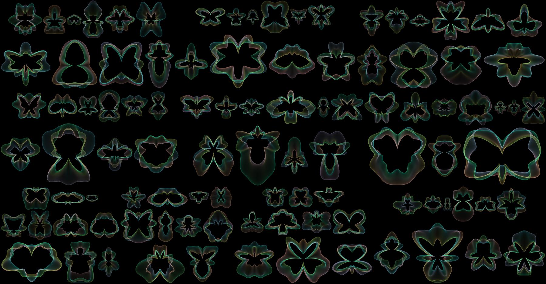 Insect-shaped mandalas: 4D noise mapped to 2D distance-based color and line generation