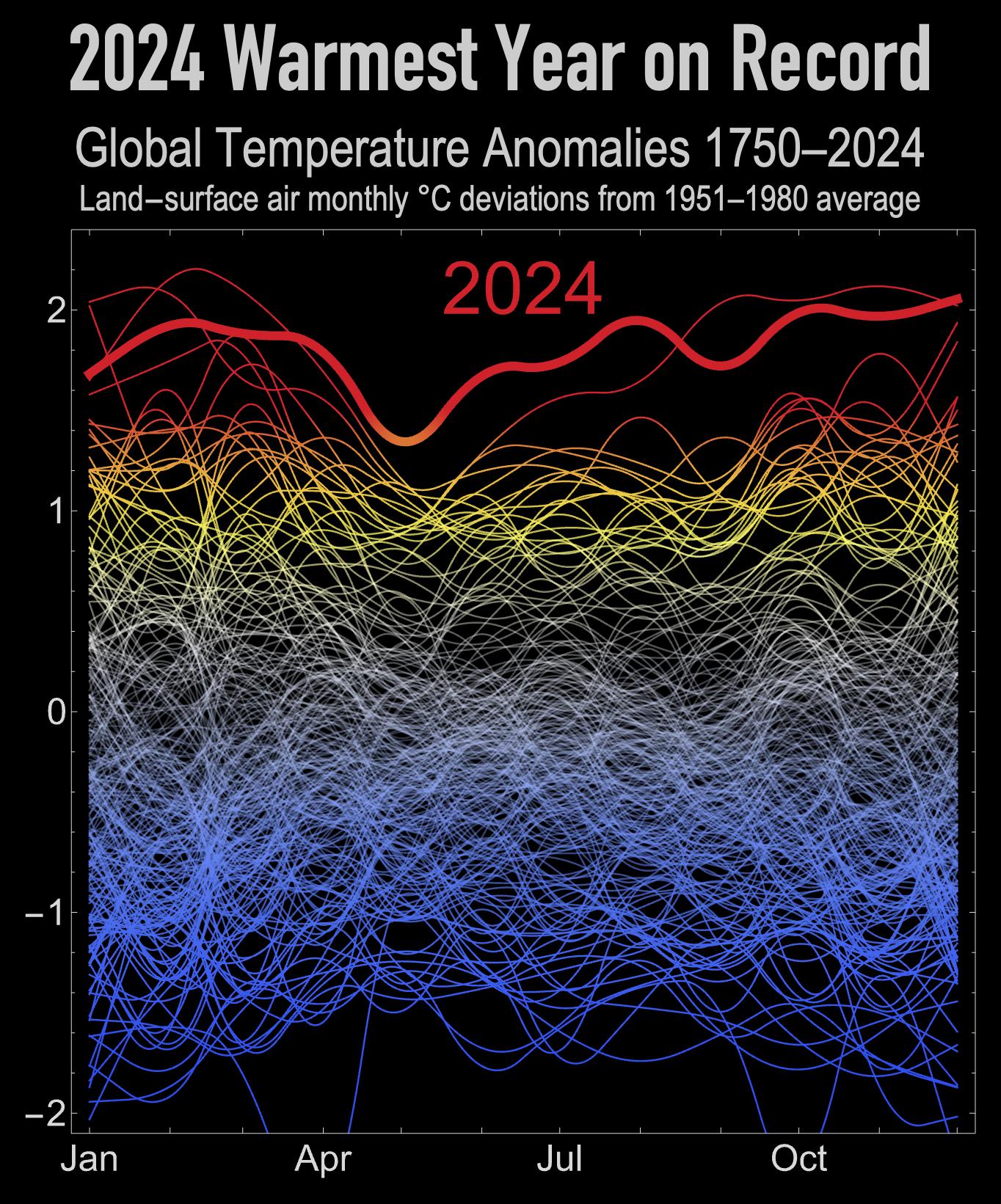 2024 was the warmest on record: Global Temperature Anomalies 1750-2024, land-surface air monthly °C