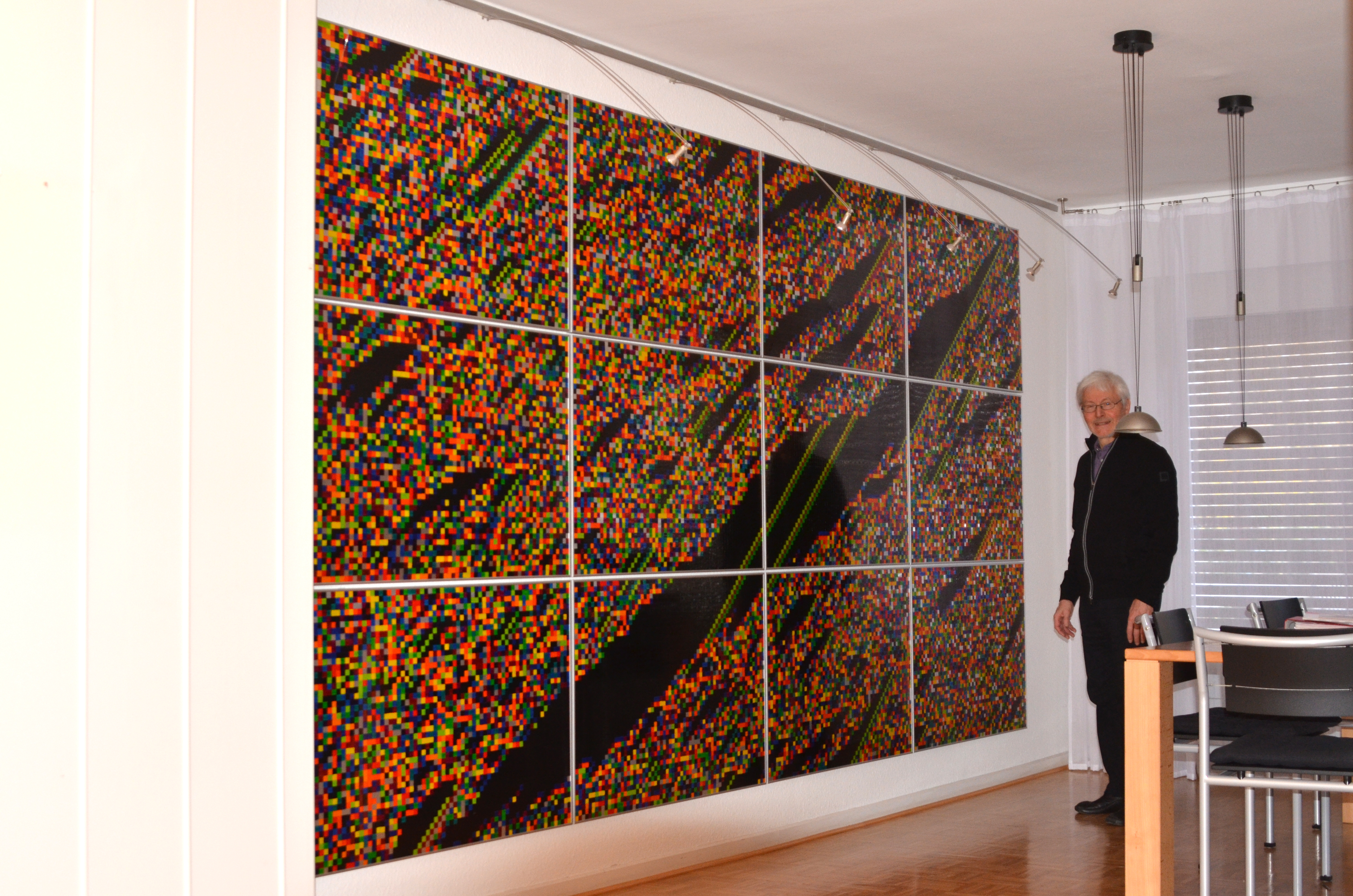 I did the the big painting with MS-Excel, Programming the Multiple was beyond my ability. I got a professional to do it. I lost the code of the multiple, when two years ago my website had been hacked and I had to build a new site in a more secure environment. So the next computational art project is the restitution of the multiple in Mathematica.![Multiple Gaussian Gradient][1]
