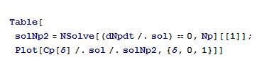 Table[ solNp2 = NSolve[(dNpdt /. sol) == 0, Np][1]; Plot[Cp[[Delta]] /. sol /. solNp2, {[Delta], 0, 1}]]