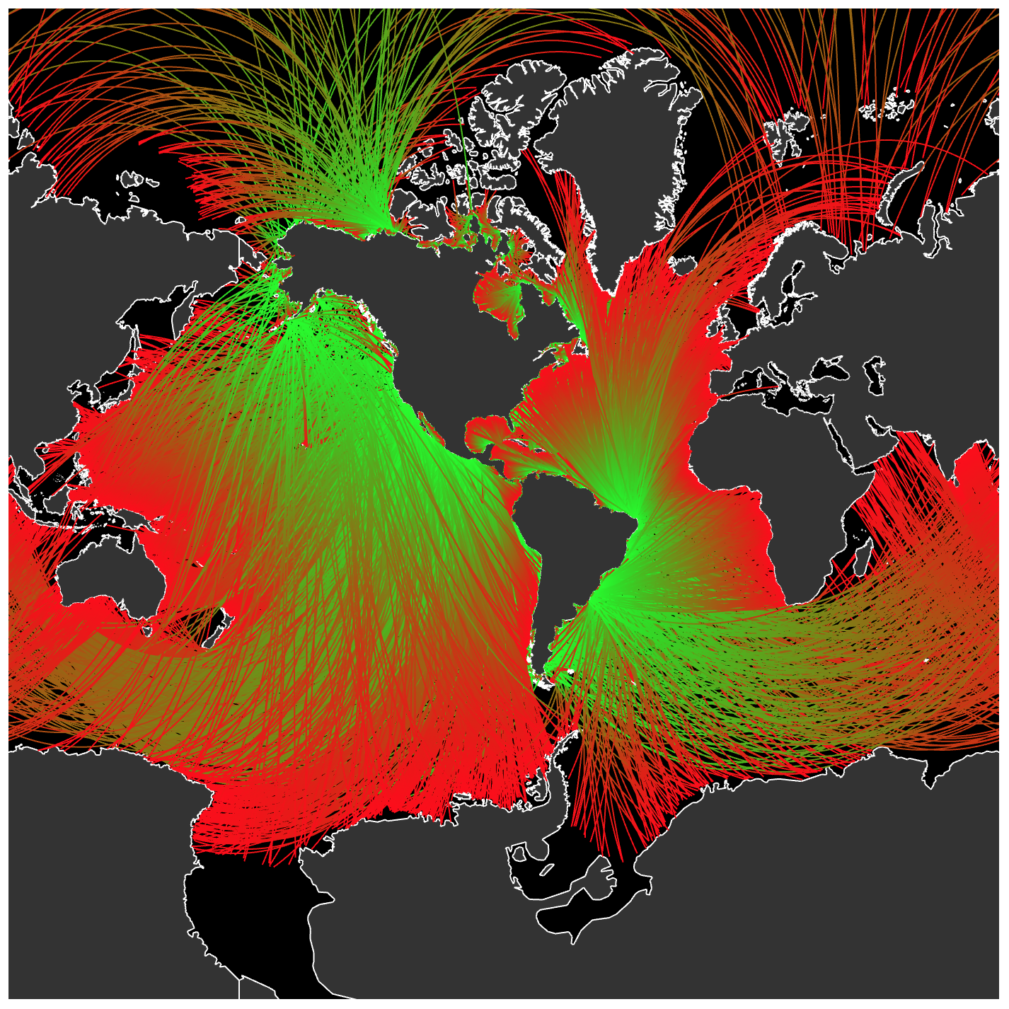 Draw them with GeoGraphics, using Vitaliy's favorite black&white mapstyle. The beginnings of the geodesics are represented in green, and their ends are in red color: